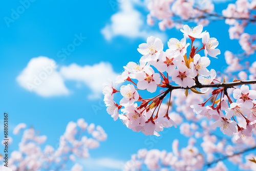 Cherry blossom close-up on blue background, spring background