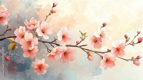Cherry Blossom Landscape Soft Pastel Watercolor Illustration with Sunlight and Flowers
