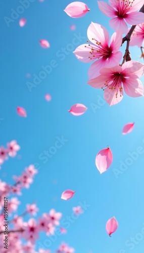 Cherry blossom petals falling against a bright blue sky, scenic, season