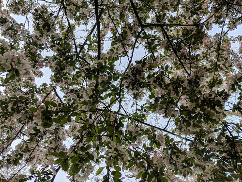 cherry blossom tree against the sky taken from below on a sunny spring day.