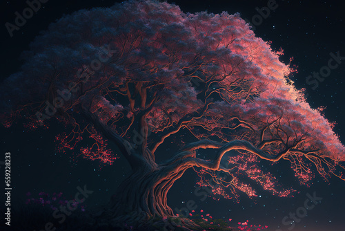 cherry blossom tree, night sky, spring, bloom, landscape, art illustration