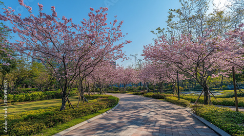 Cherry blossom trees line a peaceful pathway in a sunny park during springtime