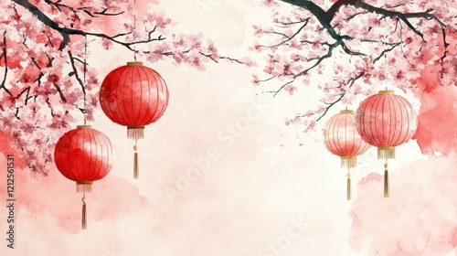 Cherry blossoms and lanterns serene chinese new year celebration watercolor art calm environment artistic viewpoint