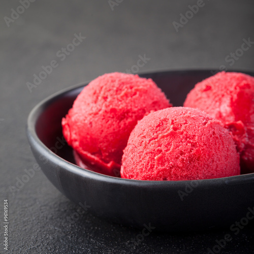 Cherry, raspberry, strawberry, cranberry , red sorbet,scoop, black stone background.