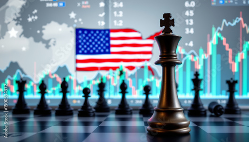Chess king piece stands prominently foreground, symbolizing strategy and power, with backdrop of stock market graphs and USA