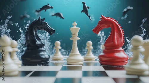 Chess pieces in a strategic battle, surrounded by water and fish, on a checkered board.