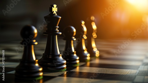 Chess Queen and Pawns 3D Illustration for Business Strategy Concept. Clear Focus with Sunlit Contrasts and Blurred Background.