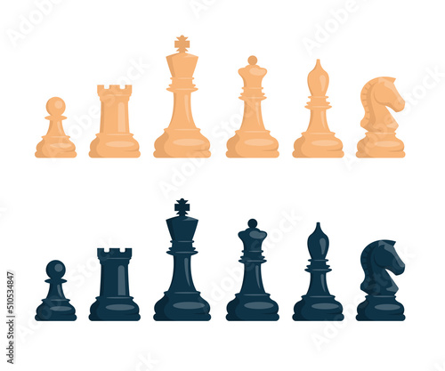 Chess. Set of white and black chess pieces. Knight, rook, pawn, bishop, king, queen. Vector image.