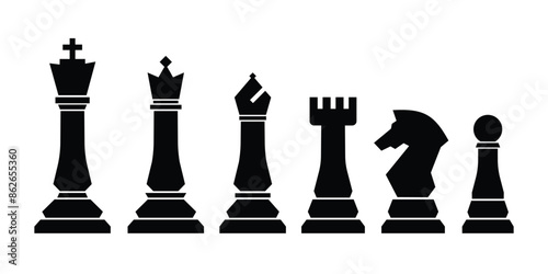 Chess vector icons set. Black flat icons with chess. King, queen, pawn, horse and rook. Vector 10 Eps.