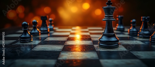 Chessboard strategy with a black King in focus, competitive mind games.