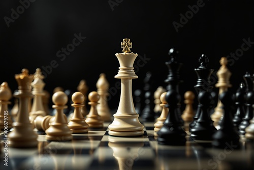 Chessboard with strategic queen piece standing among other chess pieces.