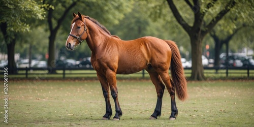 Chestnut Foal Standing Gracefully in a Park Surrounded by Greenery with Ample Space for Text and Branding