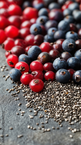 Chia seeds and berries on soft gray surface, health food texture focus