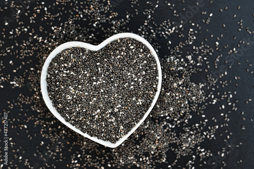 Chia seeds (Salvia hispanica) in heart-shaped bowl, gluten free ancient grain for healthy diet on dark background, selective focus