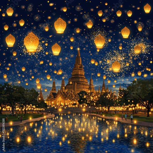 Chiang Mai's Festive Skyline: Stunning Vector Background Illustrating a Celebration of Fireworks and Lanterns