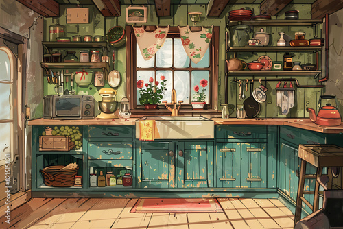 Chibi Art of Kitchen with a farmhouse sink and rustic decor elements,Romantic era landscapes