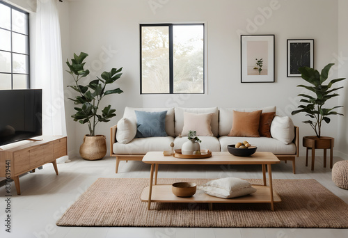 Chic and sleek living room design featuring a cozy sofa, wooden accents, and expansive windows in a modern contemporary residence