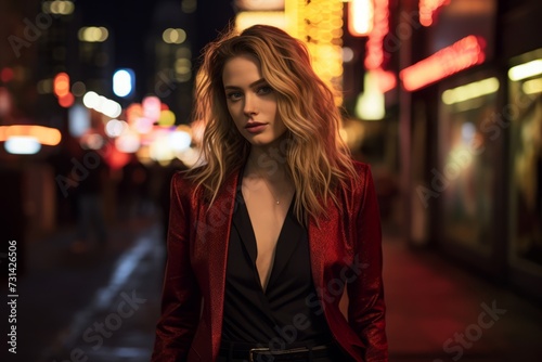 Chic businesswoman in a bold crimson blazer and black cigarette pants walking confidently on a neon-lit city street