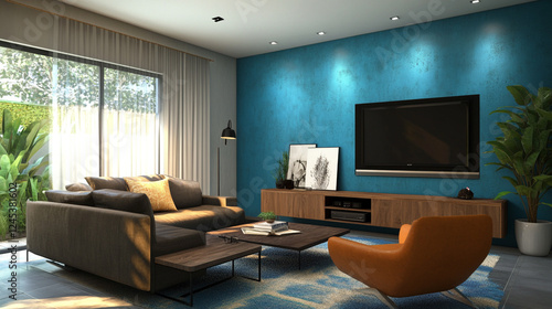 chic dark room featuring navy blue armchairs with modern accents offering a trendy lounge, elegant living room with gray sofa, blue wall paneling, and warm lighting.