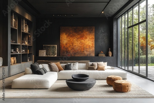 chic modern interior with dark walls and warm lighting showcasing a stylish mockup space for art or design presentations evoking a calm and sophisticated atmosphere