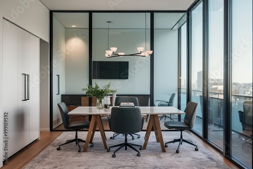 Chic Modern Workspace with Soft Focus and Expansive Glass Windows