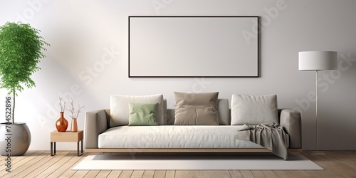 Chic Scandinavian home interior with a grey sofa, small retro table, stylish accessories, and a mock-up poster frame. Sophisticated decor with a modern carpet on brown wooden parquet.