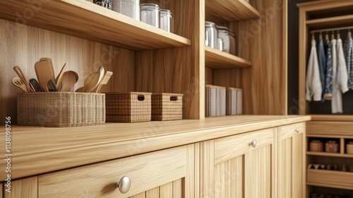 Chic wooden kitchen in 3D illustration with open shelving and wardrobe spaces, blending style and function in a home interior.