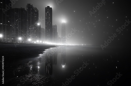 Chicago skyline reflecting on lake michigan at night in monochrome