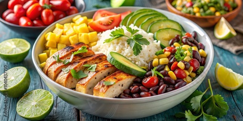 Chicken and Black Bean Rice Bowl with Corn, Tomatoes, and Cucumbers, Food Photography, Healthy Eating , Meal Prep , Recipe