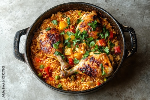 Chicken and rice dish Spanish food long grain white rice with chicken and veggies in a saucepan on a concrete table overhead view close up shot
