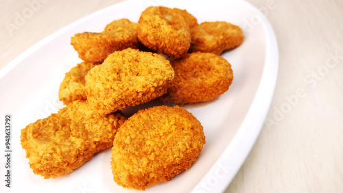 Chicken breast fillet in a crispy breading known as Nuggets on a white plate