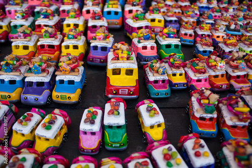 Chicken buses souvenirs at Chichicastenango market Guatemala