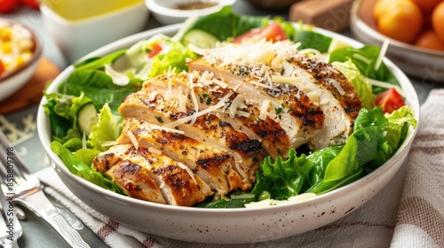 Chicken Caesar Salad with Grilled Chicken Parmesan Cheese in White Bowl