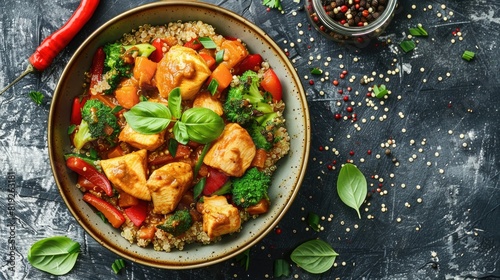 Chicken curry with quinoa and steamed vegetables in a bowl on a gray table closeup, healthy balanced diet, flat lay