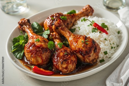 Chicken drumsticks marinated in honey, soy, and ginger served with rice, chili, leafy greens, and herbs on a white plate