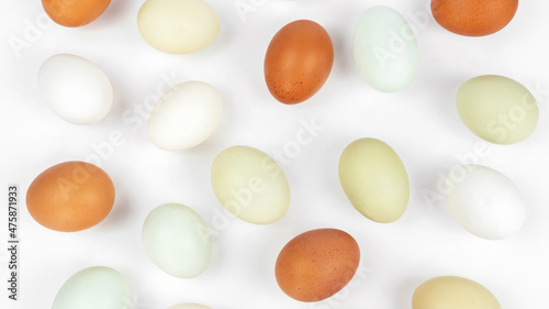 Chicken eggs pattern top view. Organic eggs scattered on a white background. Chicken Easter eggs banner with copy space.