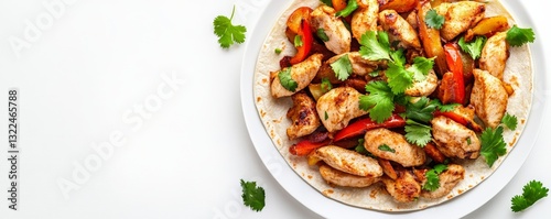 Chicken fajitas with a sprinkle of fresh cilantro, rustic presentation, isolated on white background