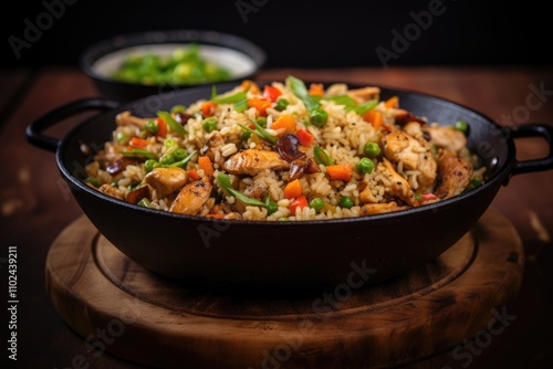 Chicken fried rice cooked and presented in a wooden setting viewed from the front