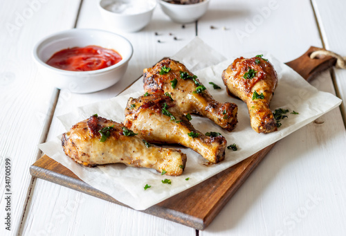 Chicken legs on a wooden background. Barbecue. Grill. American cuisine. Recipe. Rustic.