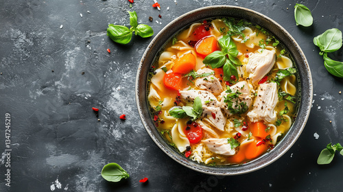 Chicken Noodle Soup with Vegetables and Fresh Basil