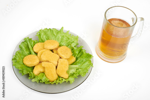 chicken nuggets , vegetables on a white plate, and beer isolated on white