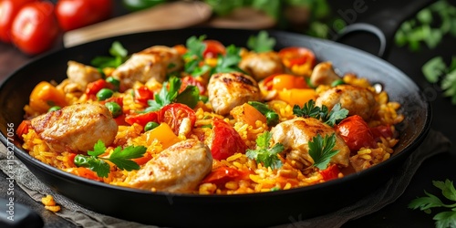Chicken paella featuring tomatoes and peppers showcases a traditional dish. This enticing chicken paella highlights vibrant ingredients, making it a perfect representation of rich culinary tradition.