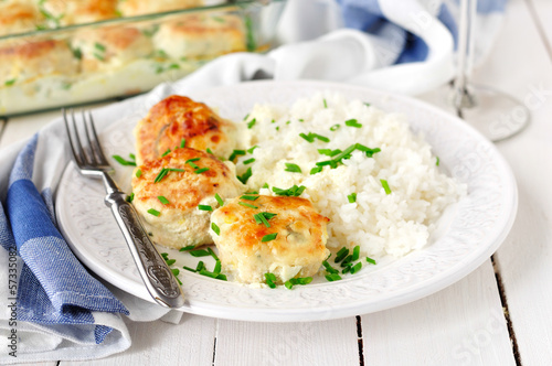 Chicken Patties Baked with Sour Cream Sauce, Served with Rice
