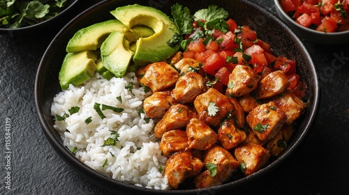 Chicken, rice, avocado, and pico de gallo in a bowl.
