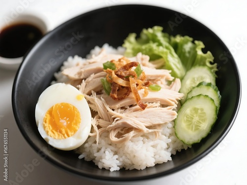 Chicken Rice Bowl. Shredded chicken over steamed rice, soft-boiled egg, cucumber, lettuce. Crispy shallots on top with optional soy sauce