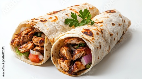 Chicken shawarma served in flatbread with yogurt sauce on white background