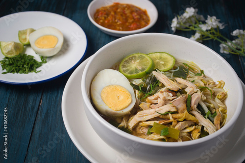 Chicken Soto or Soto Ayam in Indonesia. Soto ayam is a traditional Indonesian dish which uses ingredients such as chicken, vermicelli, bean sprout with turmeric as main ingredient add in the broth.