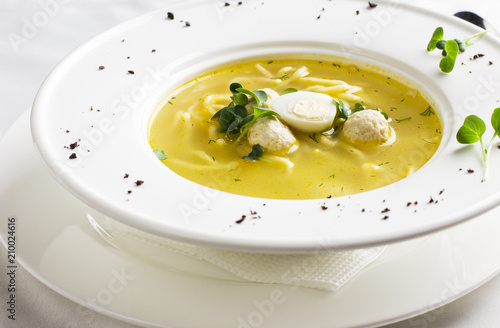 Chicken soup with meatballs, quail eggs and noodles in white plate