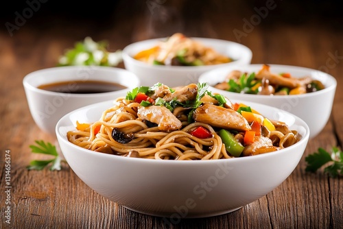 Chicken stir-fry noodles. Delicious dish served in bowls
