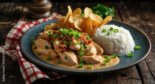 Chicken stroganoff is a dish made with sour cream and tomato extract, served with rice and potato chips, presented on a rustic wooden table.